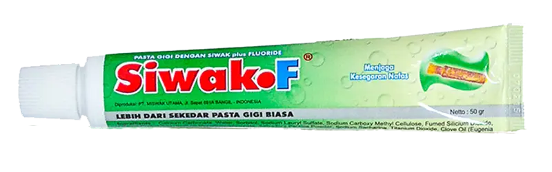 Pasta Gigi dengan SIWAK plus FLUORIDE Merawat dan melindungi kesehatan gigi dan gusi disertai fluoride untuk mencegah plak, radang gusi dan gigi berlubang. Juga bagus untuk menjaga kesegaran mulut dan nafas.